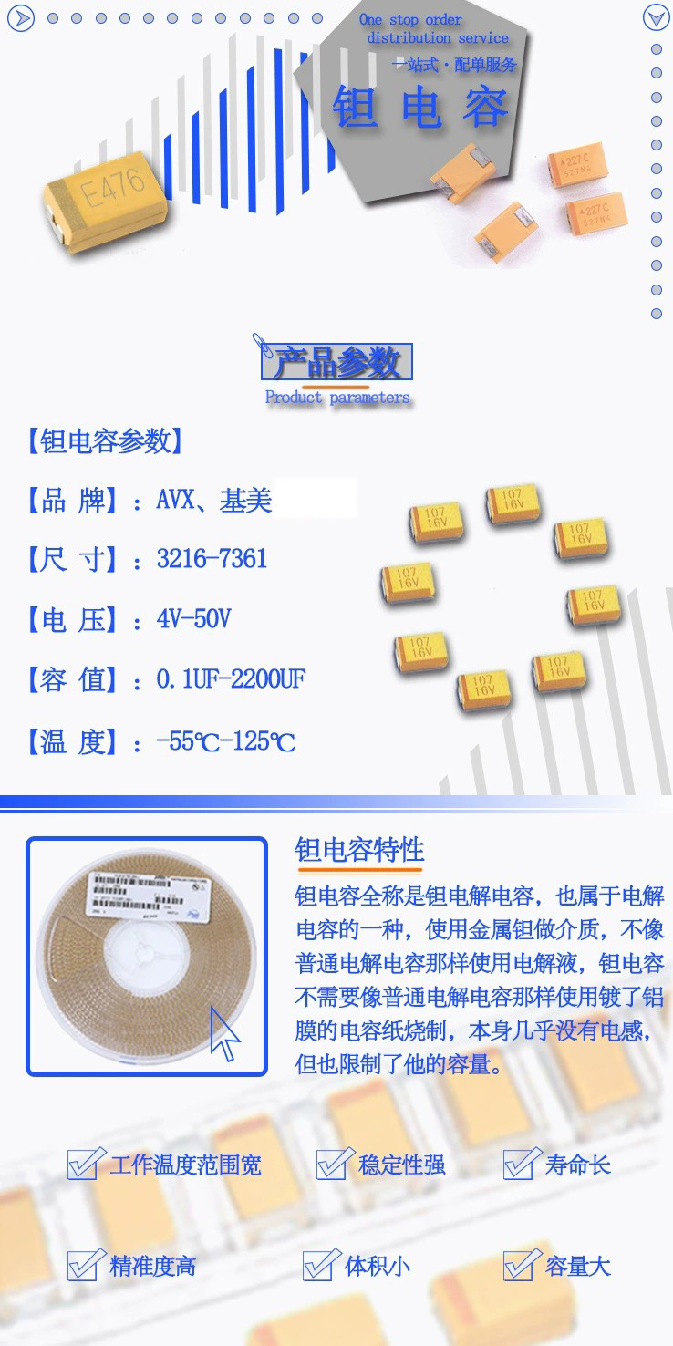 鉭電容是電容器中體積小而又能達到較大電容量的產(chǎn)品,是1956年由美國貝爾實驗室首先研制成功的,它的性能優(yōu)異。鉭電容器外形多種多樣,并制成適于表面貼裝的小型和片型元件。