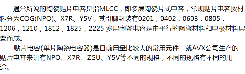 通常所說的陶瓷貼片電容是指MLCC,即多層陶瓷片式電容,常規(guī)貼片電容按材料分為COG(NPO)、X7R、Y5V,其引腳封裝有0201,0402,0603,0805,1206,1210,1812,1825,2225 多層陶瓷電容是由平行的陶瓷材料和電極材料層疊而成。